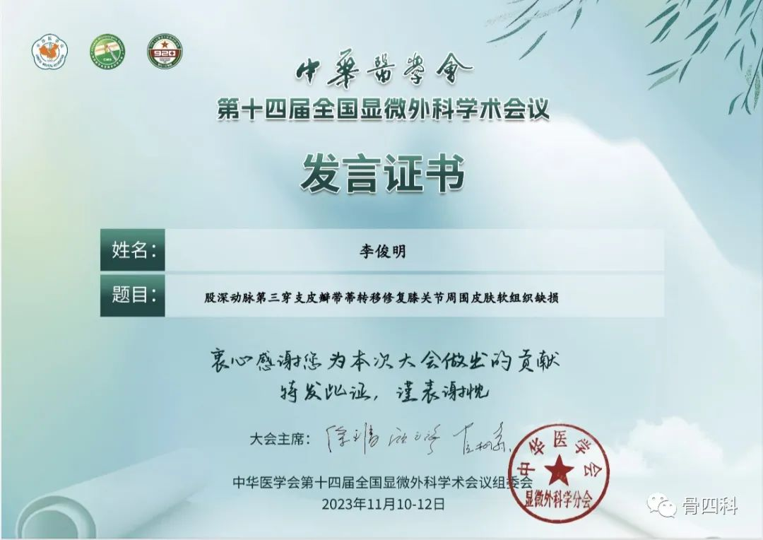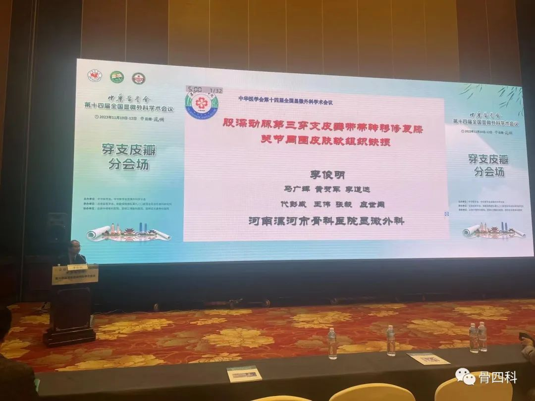 在穿支皮瓣分會場,李俊明就《股深動脈第三穿支皮瓣帶蒂轉移修復膝關節(jié)周圍皮膚軟組織缺損》作主題演講,并和同仁們展開討論。