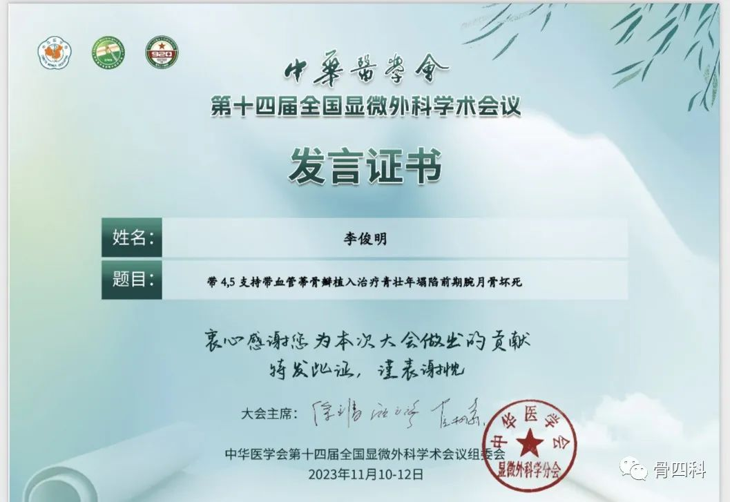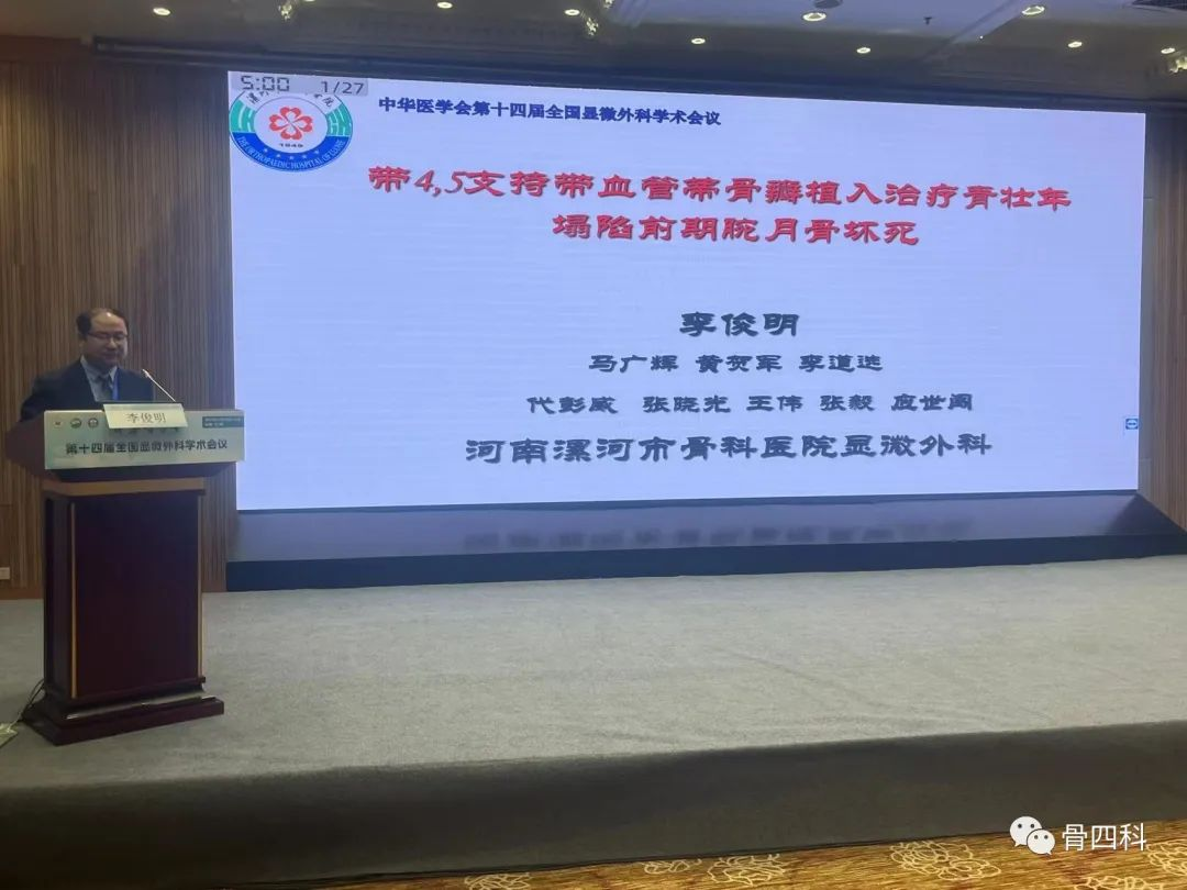 在骨顯微修復分會場,李俊明就《帶四、五支持帶血管蒂骨瓣植入治療青壯年塌陷前期腕月骨壞死》展開精彩發(fā)言。