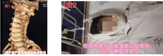 兒童寰樞椎半脫位早期治療并不復雜,關(guān)鍵時要高度重視及時就診正規(guī)治療,切勿亂投醫(yī),勿要不正規(guī)盲目簡單粗暴快速手法復位。要盡早至脊柱??疲\斷明確后一般不需要輸液、抽血等不必要檢查,通常應用枕頜帶(Glisson)平臥位取正中位牽引(見圖2),傷后2天內(nèi)盡可能持續(xù)小重量牽引,牽引過程中會緩慢糾正寰樞椎半脫位,牽引重量實用骨科學建議兒童約1.5-2kg即可,一般1-3天復位,兒童表現(xiàn)為頸部旋轉(zhuǎn)功能恢復,疼痛消失??蛇M一步復查X線或CT了解復位情況,盡可能牽引1-2周。然后可以進一步頸托固定保護約1月為宜。治療不及時發(fā)生旋轉(zhuǎn)固定半脫位或嚴重陳舊半脫位,會導致頸疼、斜頸、斜視、面部不對稱,保守無效時需要手術(shù)治療。當然我們盡可能要避免這種結(jié)局。