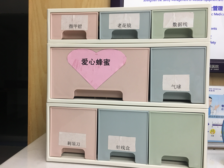 患者住院期間往往會(huì)因?yàn)榇颐θ朐夯蚴强紤]不周物品準(zhǔn)備的不齊全。比如,老年患者忘了戴花鏡,拿著各種報(bào)告單卻看不清,給住院生活帶來(lái)了不便;需要記錄電話號(hào)卻沒(méi)有紙和筆……這些住院患者日常生活中的不便之處,醫(yī)護(hù)人員都看在眼里,記在心上。原有的便民箱物品不能滿足患者需求,護(hù)士長(zhǎng)組織對(duì)全科護(hù)士、醫(yī)生、患者及家屬進(jìn)行調(diào)研,大家集思廣益,收集并整理了患者使用頻率高的物品,專門購(gòu)置了格子組合式的儲(chǔ)物箱來(lái)收納,患者可以根據(jù)自己的需求借用,解決患者和家屬的燃眉之急,為患者提供更加溫馨、舒適的住院環(huán)境,讓他們?cè)谖骞倏撇^(qū)感受到家的溫暖。