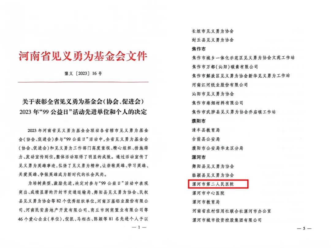 近日,市二院被河南省見義勇為基金會授予全省2023年“99公益日”活動先進(jìn)單位榮譽(yù)稱號。