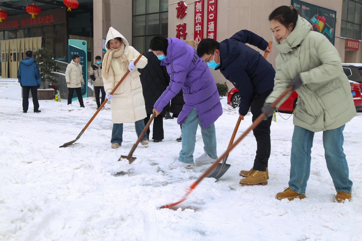 醫(yī)院領(lǐng)導(dǎo)身先士卒,干部職工們干勁十足。大家手持鐵鍬、掃帚等工具,敲冰層、掃積雪,迅速將急診、門診樓、120通道等重點道路上的積雪和暗冰清除干凈,為生命通道掃清了障礙。