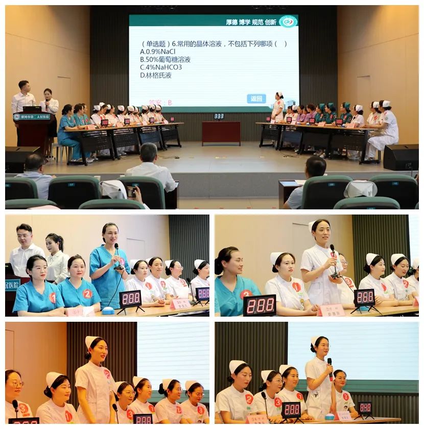 此次競賽內(nèi)容涵蓋基礎護理、??谱o理、護理團體標準、核心制度、應急預案等專業(yè)知識,分為初賽和決賽。此次活動,共有25個護理單元75名選手參加,經(jīng)過前期的層層選拔,8支代表隊24名選手參加了決賽。比賽現(xiàn)場氣氛火熱,高潮迭起,必答題環(huán)節(jié)各隊選手平分秋色,比分不相上下,隨著搶答環(huán)節(jié)的到來,比賽進入白熱化狀態(tài),各隊選手快速思考,競相搶答,上演了一場精彩紛呈的腦力與速度的較量;在風險題環(huán)節(jié),各隊選手不甘落后,幾乎是在題目出現(xiàn)的瞬間就已經(jīng)有人按下了搶答器并給出準確的答案,體現(xiàn)他們扎實的理論知識和深厚的實踐功底。