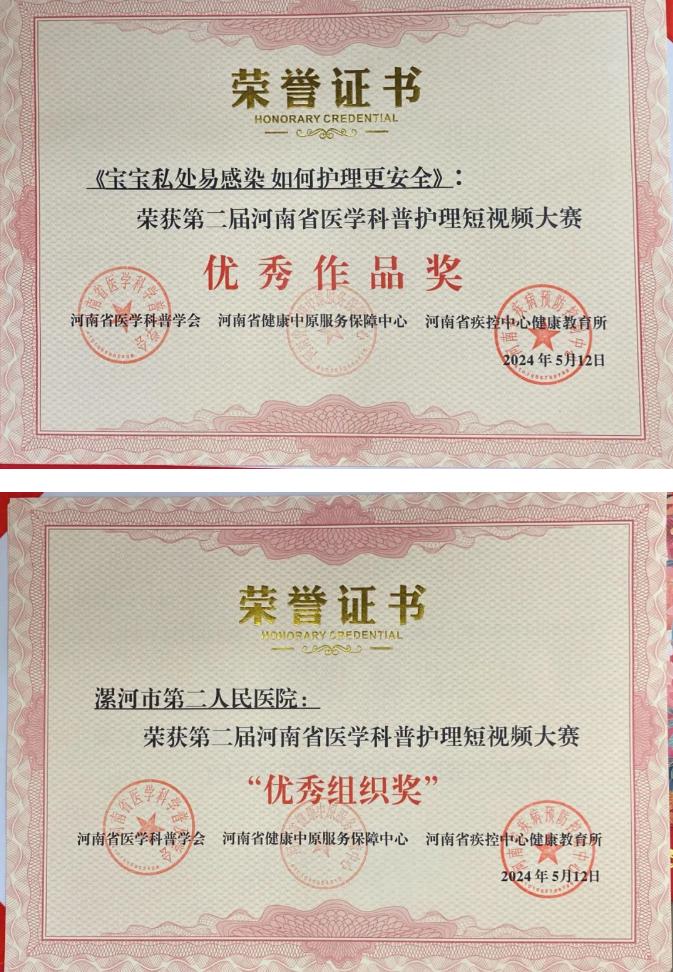 為慶祝113個(gè)國(guó)際護(hù)士節(jié),展示護(hù)理工作者的美好職業(yè)形象,引導(dǎo)公眾樹立正確的心理健康理念,5月8日,由河南省衛(wèi)生健康委宣傳處指導(dǎo),河南省醫(yī)學(xué)科普學(xué)會(huì)、河南省健康中原服務(wù)保障中心及河南省疾病預(yù)防控制中心健康教育所主辦的“第二屆河南省醫(yī)學(xué)科普護(hù)理短視頻大賽”在鄭州落下帷幕。本次比賽,市二院黨委高度重視,號(hào)召全院職工積極參與,征集優(yōu)秀護(hù)理科普短視頻,經(jīng)過積極籌備,廣泛動(dòng)員,共提交25部作品參賽。通過層層選拔,由張小玉、盧清麗、劉橋、王倩、陳星、劉曉燕護(hù)理團(tuán)隊(duì)拍攝的科普視頻《寶寶私處易感染 如何護(hù)理更安全》從全省18個(gè)地市442家醫(yī)療機(jī)構(gòu)2691部科普短視頻作品中脫穎而出,在本次大賽中榮獲優(yōu)秀獎(jiǎng)!同時(shí)醫(yī)院榮獲“優(yōu)秀組織獎(jiǎng)”!