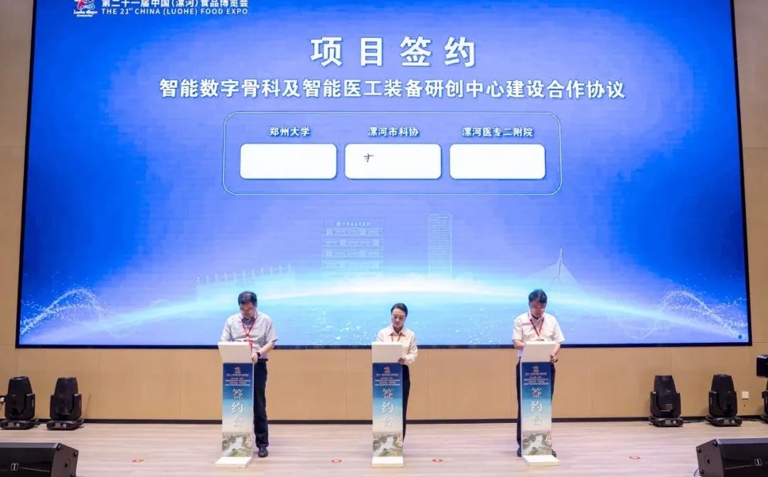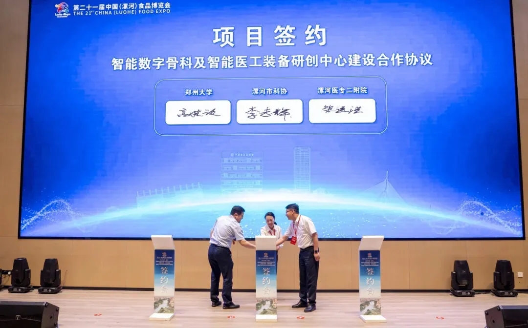 開幕式現(xiàn)場,漯河市骨科醫(yī)院(漯河醫(yī)專二附院、漯河市立醫(yī)院)黨委書記柴運洪與鄭州大學(xué)機械與動力工程學(xué)院院長、教授高建設(shè),漯河市科協(xié)黨組書記、主席李志輝簽訂了智能數(shù)字骨科及智能醫(yī)工裝備研創(chuàng)中心建設(shè)合作協(xié)議。