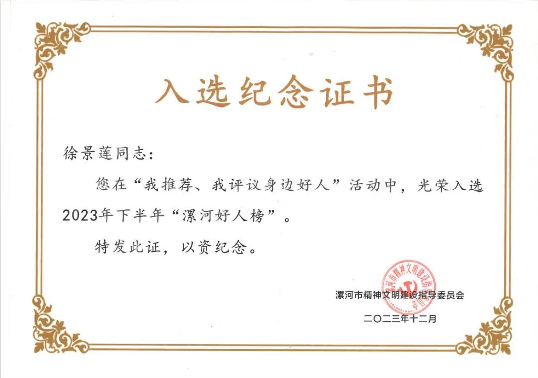 為認(rèn)真貫徹落實(shí)黨的二十大精神和《新時(shí)代公民道德建設(shè)實(shí)施綱要》,扎實(shí)推進(jìn)公民道德建設(shè),大力培育時(shí)代文明新風(fēng),持續(xù)打造“漯河好人”道德品牌,市委宣傳部、市文明辦、市委市直工委、市總工會(huì)、團(tuán)市委、市婦聯(lián)組織開(kāi)展了2023年下半年“漯河好人榜”上榜人物選樹(shù)活動(dòng)。經(jīng)過(guò)群眾推薦、資格審核、組委會(huì)初審、評(píng)審委員會(huì)評(píng)審、媒體公示等評(píng)選程序,共12人上榜。