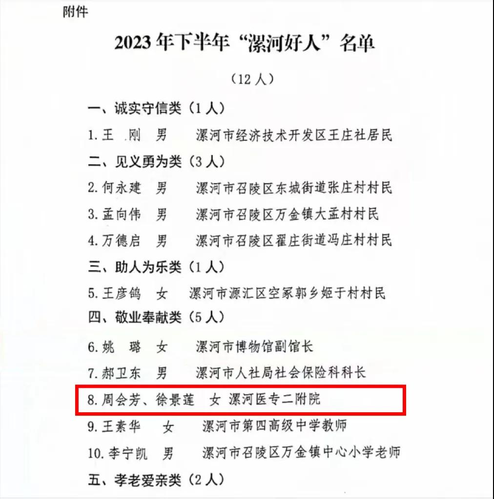 其中,來(lái)自漯河市骨科醫(yī)院(漯河醫(yī)專(zhuān)二附院、漯河市立醫(yī)院)的周會(huì)芳、徐景蓮光榮入選2023年下半年“漯河好人榜”!