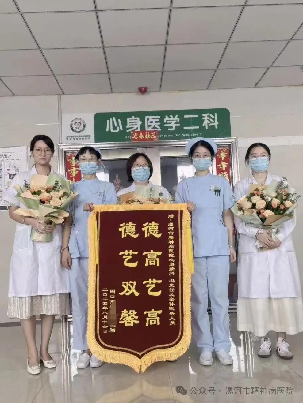 在醫(yī)師節(jié)當天,漯河市精神病醫(yī)院心身醫(yī)學(xué)二科收到了來自周口市患者—面繡著“德高藝高,德藝雙馨”的錦旗,為醫(yī)師節(jié)增添了一抹璀璨的光彩。