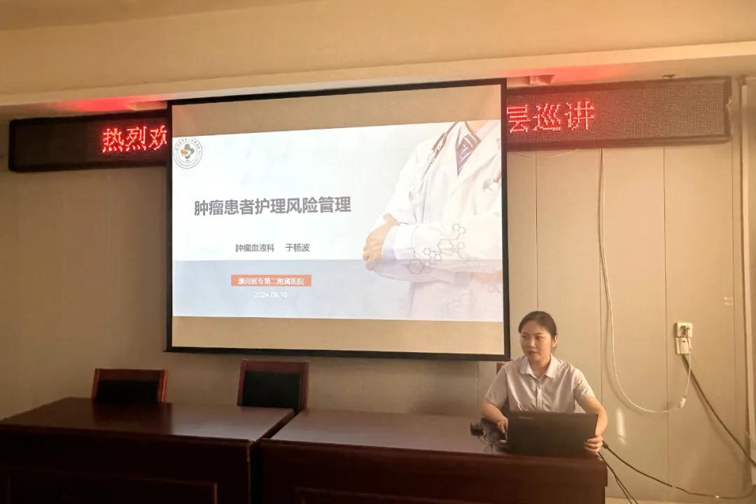 此次巡講中,于楊波護(hù)士長(zhǎng)、張姣主管護(hù)師、王惠娟主管護(hù)師分別就《腫瘤患者護(hù)理風(fēng)險(xiǎn)管理》《靜脈治療血管通路管理規(guī)范》《腫瘤患者癌痛規(guī)范化管理》為主題進(jìn)行了精彩分享。其中于楊波護(hù)士長(zhǎng)主要是從腫瘤患者常見的護(hù)理風(fēng)險(xiǎn)問(wèn)題如何識(shí)別、評(píng)估、規(guī)范管理以及護(hù)理風(fēng)險(xiǎn)管理的一些措施、經(jīng)驗(yàn)、理念進(jìn)行了分享。