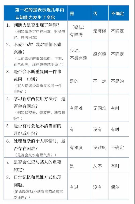 目前比較常用的是AD8癡呆篩查量表,它通過(guò)8個(gè)簡(jiǎn)單的問(wèn)題,快速評(píng)估是否有阿爾茨海默病風(fēng)險(xiǎn)。如果出現(xiàn)2個(gè)及以上的表現(xiàn),則要及時(shí)到醫(yī)院就診咨詢,進(jìn)一步明確診斷。 (殷旭芳)