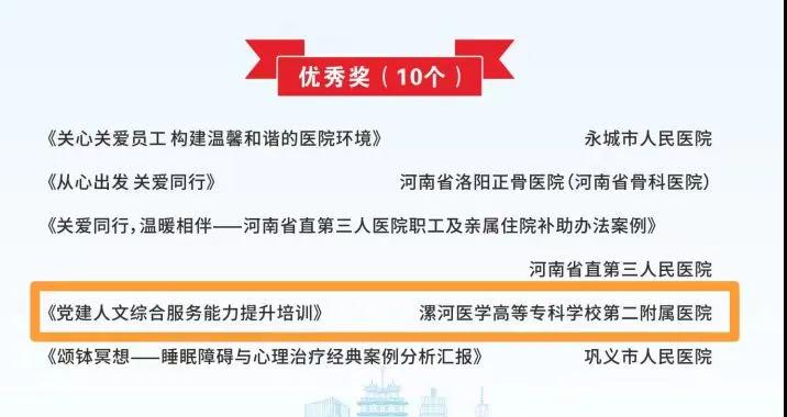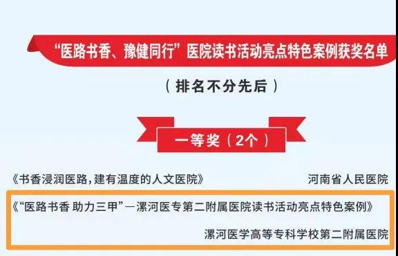 大會(huì)通報(bào)了系列活動(dòng)優(yōu)秀入圍作品名單,其中,漯河市骨科醫(yī)院(漯河醫(yī)專二附院、漯河市立醫(yī)院)報(bào)送的作品《醫(yī)路書(shū)香助力三甲》榮獲“醫(yī)路書(shū)香、豫健同行”醫(yī)院讀書(shū)活動(dòng)亮點(diǎn)特色案例一等獎(jiǎng);《大醫(yī)吳廣良》榮獲“身邊的榜樣”敘事醫(yī)學(xué)故事一等獎(jiǎng);《黨建引領(lǐng)人文綜合服務(wù)能力提升》榮獲“員工關(guān)愛(ài)計(jì)劃”優(yōu)秀案例!
