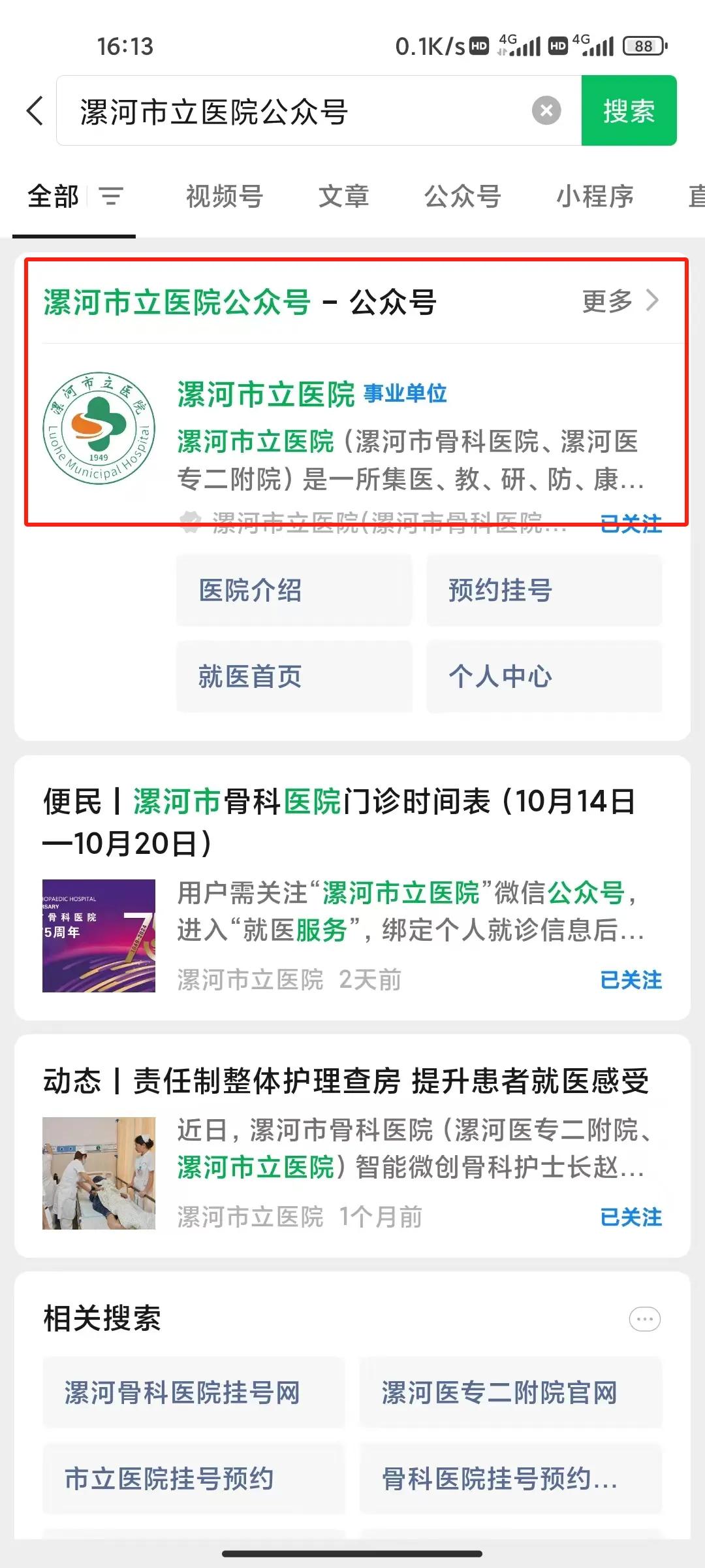 01、進(jìn)入微信主界面,搜索公眾號-【漯河市立醫(yī)院公眾號】并關(guān)注。