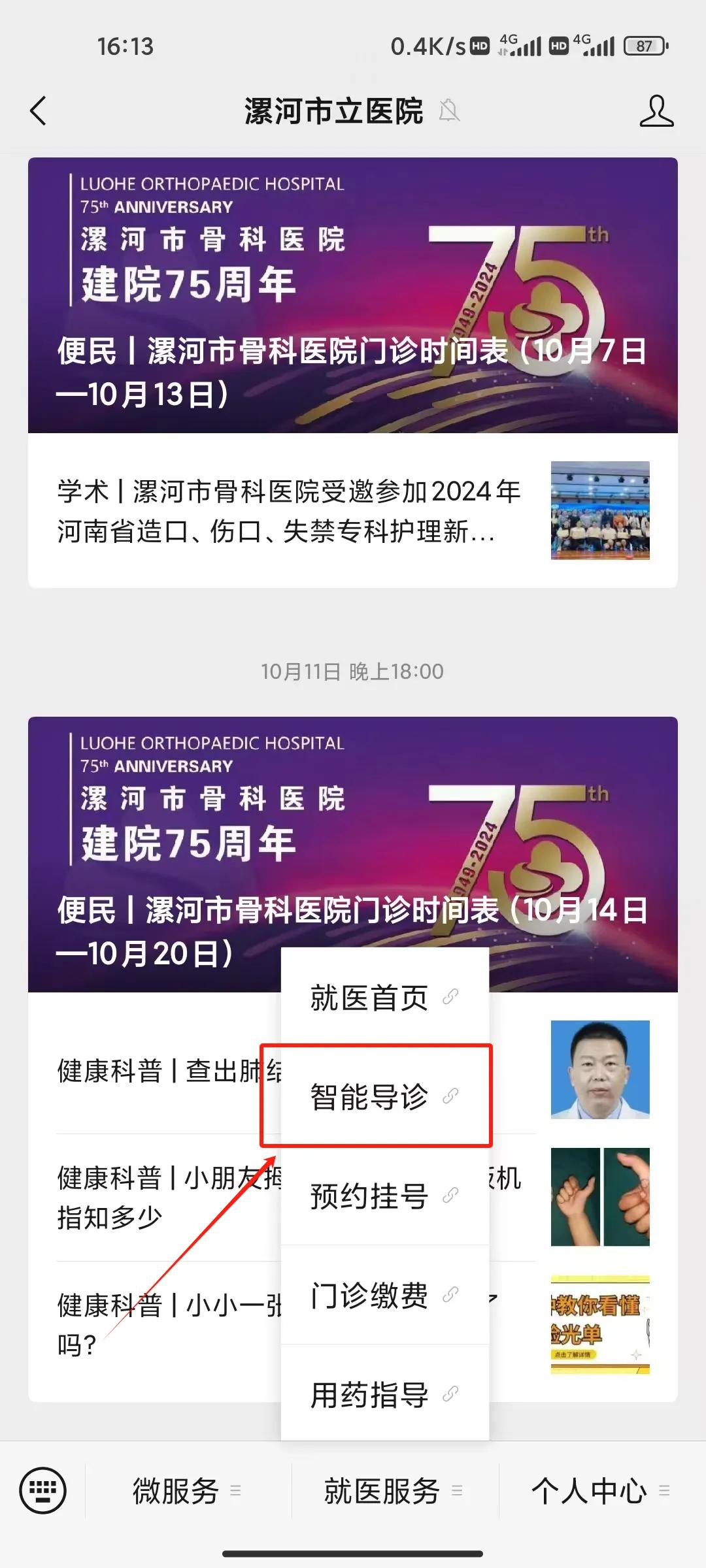 (1)關(guān)注微信公眾號點擊就醫(yī)首頁,進(jìn)入公眾號主頁,點擊智能導(dǎo)診;