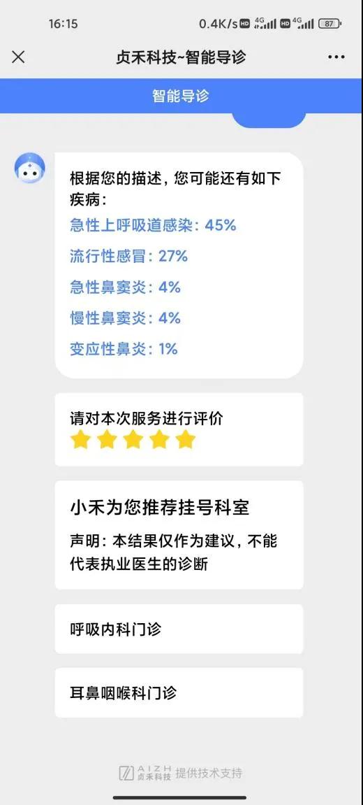 智能導(dǎo)診系統(tǒng)是通過多輪人機(jī)對話,根據(jù)患者對癥狀的描述了解患者病情,判斷患者所患疾病概率,自動為患者推薦最合適的掛號科室,并展示相應(yīng)的醫(yī)療信息,解決患者盲目就醫(yī)問題,有效提升患者就醫(yī)體驗,緩解醫(yī)院導(dǎo)診咨詢壓力,推動精準(zhǔn)就醫(yī)服務(wù)。