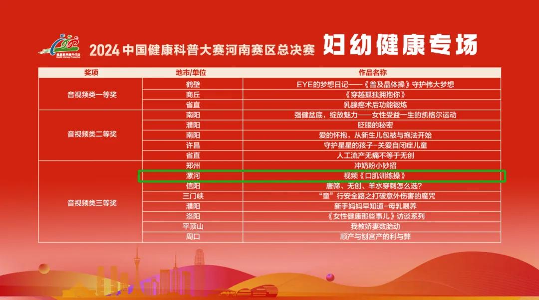 在大賽中,市二院憑借卓越表現(xiàn),原創(chuàng)作品《雙腿的控訴》獲得慢性病類(lèi)作品三等獎(jiǎng)、《背包俠客》獲得婦幼健康類(lèi)作品三等獎(jiǎng)、視頻作品《口肌訓(xùn)練操》獲得三等獎(jiǎng),為健康知識(shí)普及書(shū)寫(xiě)了精彩篇章。