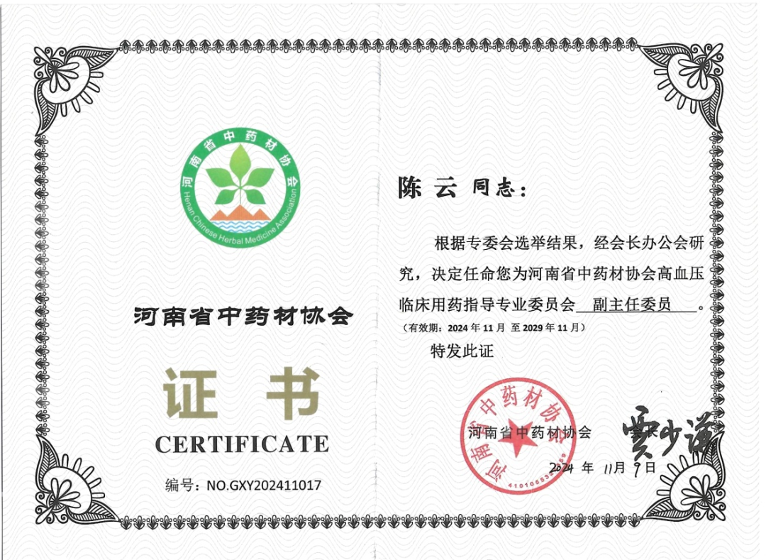 陳云表示,此次當選河南省中藥材協(xié)會高血壓臨床用藥指導專業(yè)委員會副主任委員,是對漯河市中醫(yī)院在高血壓疾病診治、高血壓??平ㄔO及學術水平等方面的肯定,同時更是一種責任和使命。接下來,科室團隊會更加精研技術,探索藥技融合、中西醫(yī)結(jié)合運用多元化手段精準診治高血壓疾病,造福更多的高血壓人群。