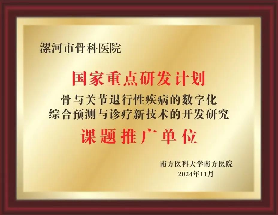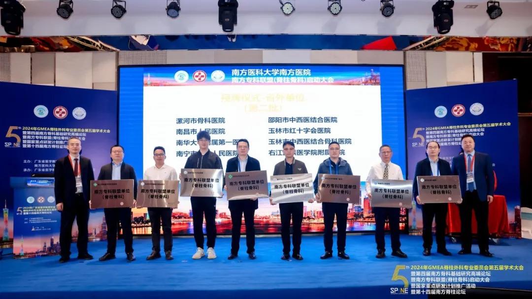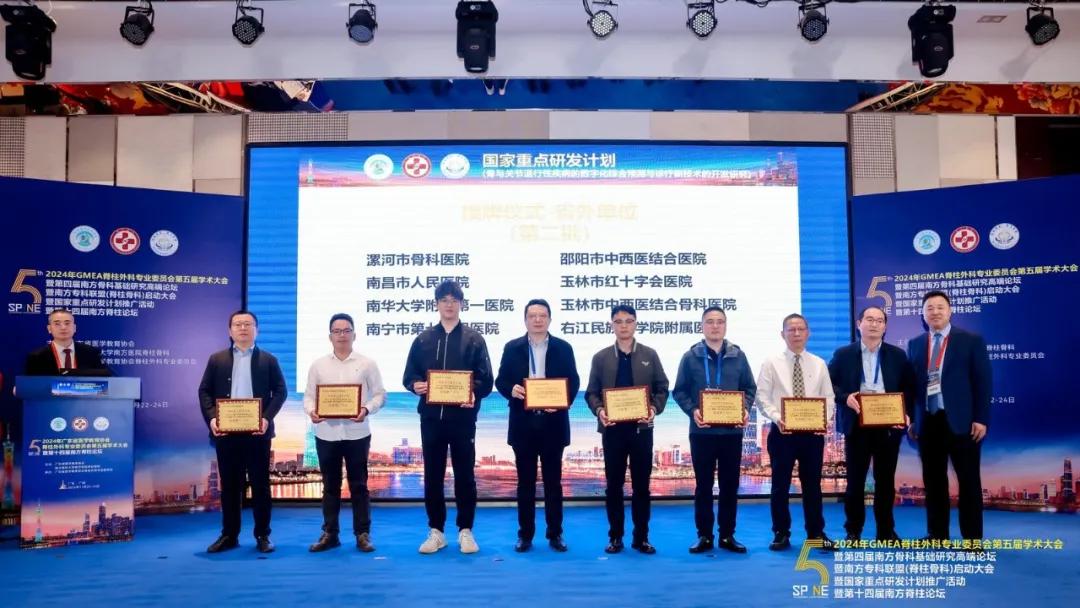11月22日—24日,由廣東省醫(yī)學(xué)教育協(xié)會(huì)、南方醫(yī)科大學(xué)南方醫(yī)院脊柱骨科聯(lián)合主辦,廣東省醫(yī)學(xué)教育協(xié)會(huì)脊柱外科專業(yè)委員會(huì)承辦的“2024年GMEA脊柱外科專業(yè)委員會(huì)第五屆學(xué)術(shù)大會(huì)”在廣東廣州成功舉行。在南方??坡?lián)盟(脊柱骨科)啟動(dòng)大會(huì)暨國(guó)家重點(diǎn)研發(fā)計(jì)劃推廣活動(dòng)上,漯河市骨科醫(yī)院(漯河醫(yī)專二附院、漯河市立醫(yī)院)榮獲“國(guó)家重點(diǎn)研發(fā)計(jì)劃-骨與關(guān)節(jié)退行性疾病的數(shù)字化綜合預(yù)測(cè)與診療新技術(shù)的開發(fā)研究課題推廣單位”與“南方??坡?lián)盟單位(脊柱外科)”雙項(xiàng)授牌!