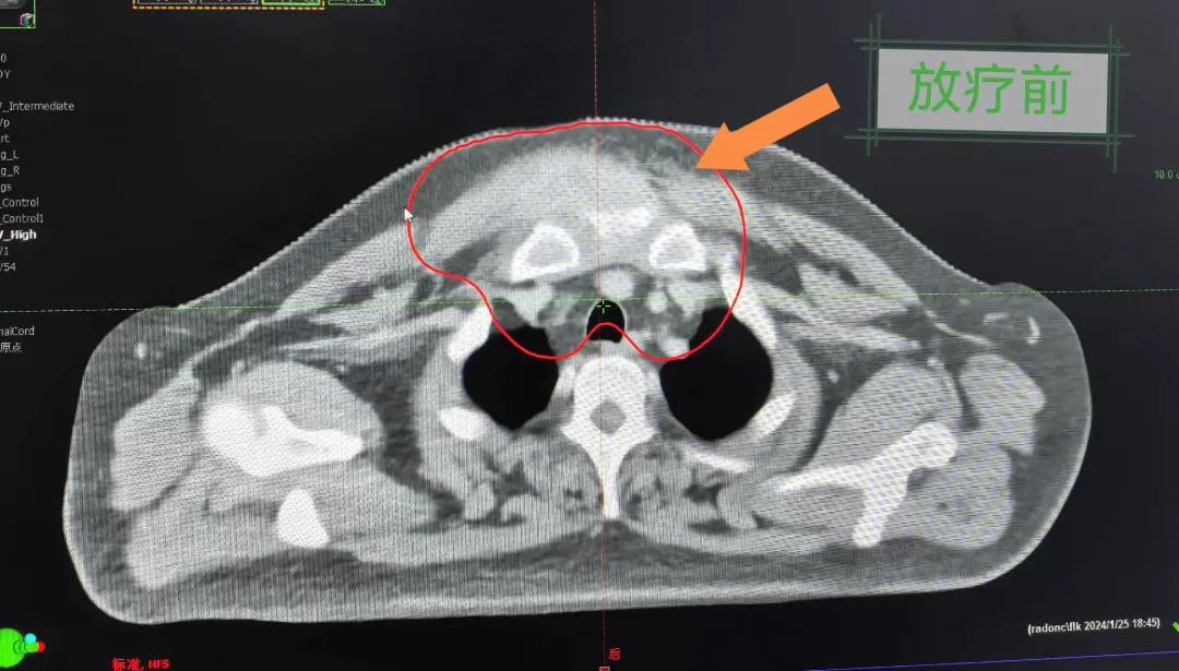 患者經(jīng)多方咨詢與打聽,在家屬的陪同下來到市二院放療科找到趙亮主任尋求幫助。入院后迅速完善了相關(guān)檢查,診斷為罕見的“胸壁腫瘤”。因腫瘤體積大,侵犯周圍組織,手術(shù)治療難度較大,經(jīng)院內(nèi)多學(xué)科會(huì)診后,決定采用無創(chuàng)的局部放射治療。在初步告知患者及家屬治療方案時(shí),病人及家屬都擔(dān)心預(yù)后及放療可能引起的不適,趙亮主任詳細(xì)且耐心的向家屬和病人講述放療過程中可能出現(xiàn)的不良反應(yīng),確保讓他們安心治療。
