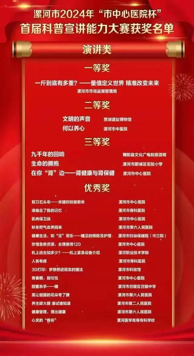 本次大賽由中共漯河市委宣傳部、中共漯河市委人才工作領(lǐng)導(dǎo)小組辦公室、漯河市科學(xué)技術(shù)協(xié)會、漯河市衛(wèi)生健康委員會聯(lián)合主辦。市中醫(yī)院積極響應(yīng)“普及科學(xué)知識,弘揚(yáng)科學(xué)精神”的大賽主旨,送演內(nèi)容豐富,形式多樣的作品,助力健康科普理念的傳播,并取得了優(yōu)異的成績。