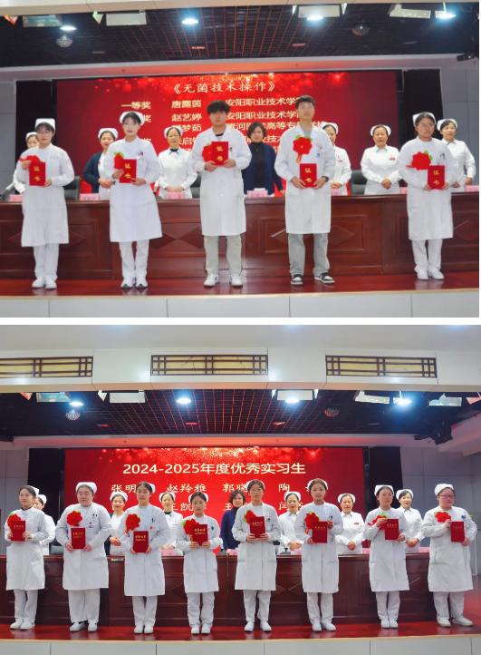 外一科護士長郭書娟、血液腫瘤科護士長袁菲分別宣讀了關(guān)于表彰技能操作競賽獲獎人員和優(yōu)秀實習(xí)生名單。隨后,對陶媛等12名護理實習(xí)生技能操作競賽獲獎人員及在2024-2025年度護理實習(xí)工作中涌現(xiàn)出的張明怡等8名優(yōu)秀實習(xí)生頒發(fā)了榮譽證書。
