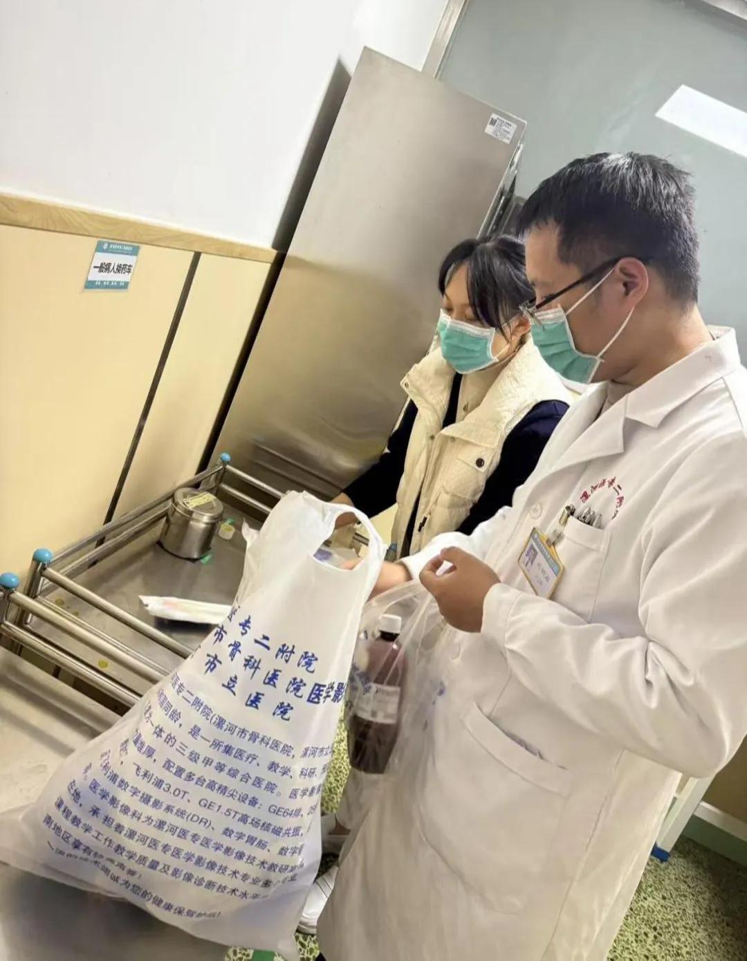 陳笑寒耐心地安撫家屬的情緒,同時(shí)迅速指導(dǎo)他們?cè)谠ソ∽o(hù)理到家平臺(tái)上進(jìn)行下單。訂單一經(jīng)接收,在閆衛(wèi)甫主任的全力支持下,她與醫(yī)生劉明啟迅速響應(yīng),僅用數(shù)分鐘便仔細(xì)核對(duì)并打包了所有必需品。盡管一天的勞累尚未消散,他們還是不顧疲憊,迎著暮色急忙趕往患者家中。