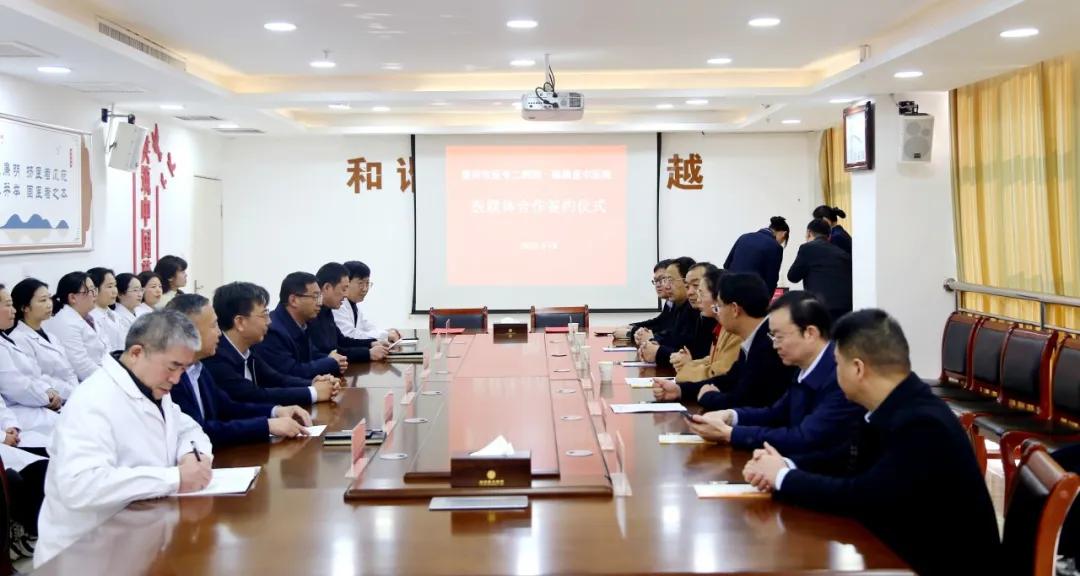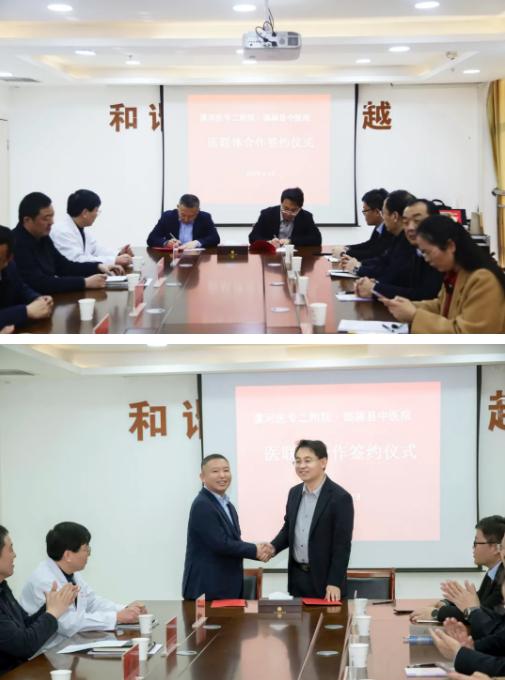 漯河醫(yī)專二附院黨委書記柴運洪與臨潁縣中醫(yī)院黨委書記田學民分別代表雙方簽訂合作協議。