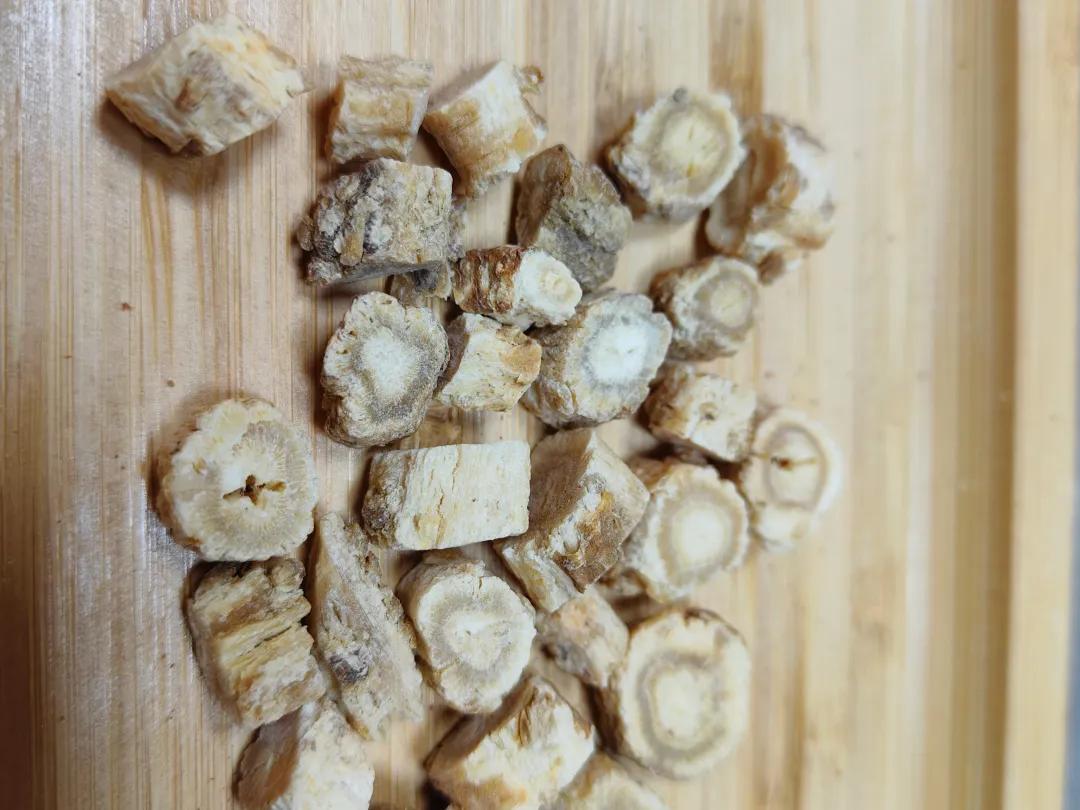 北沙參為傘形科的植物珊瑚菜的干燥根,夏、秋兩季采挖,除去須根,洗凈,置沸水中燙后,除去外皮,干燥或洗凈后直接干燥。本品氣特異,味微甘,以根條粗細(xì)均勻,質(zhì)地堅(jiān)實(shí),去凈栓皮,色黃白者為佳,切段生用。藥性甘,微苦、微寒,歸肺、胃經(jīng)。具有養(yǎng)陰清肺、益胃生津的功效??捎糜谥委煼螣嵩锟?,陰虛勞嗽痰血。本品甘潤(rùn),微苦微寒,能夠補(bǔ)肺陰,兼能夠清肺熱,用于陰虛肺燥有痰有熱之干咳少痰、久咳勞嗽或咽干音啞等癥,常與麥冬、玉竹、桑葉等配伍,如沙參麥冬湯(《溫病條辨》);治陰虛勞熱,咳嗽咳血,可與知母、川貝母、麥冬、鱉甲等同用。還可用于胃陰不足,熱病津傷,咽干口渴,本品甘寒能養(yǎng)胃陰,苦寒能清胃熱,常用于胃陰虛有熱之口干多飲、饑不欲食、大便干結(jié)、舌苔光剝或舌紅少津,或胃脘隱痛、干嘔、嘈雜,或熱病津傷,咽干口渴,常與石斛、玉竹、烏梅等養(yǎng)陰生津之品同用。胃陰脾氣俱虛者,宜與山藥、太子參、黃精等養(yǎng)陰、益氣健脾之品同用。煎服常用量為5~12g,不宜與藜蘆通用。