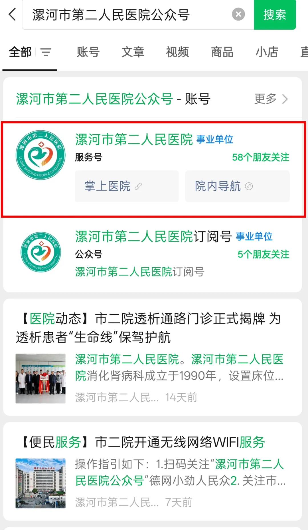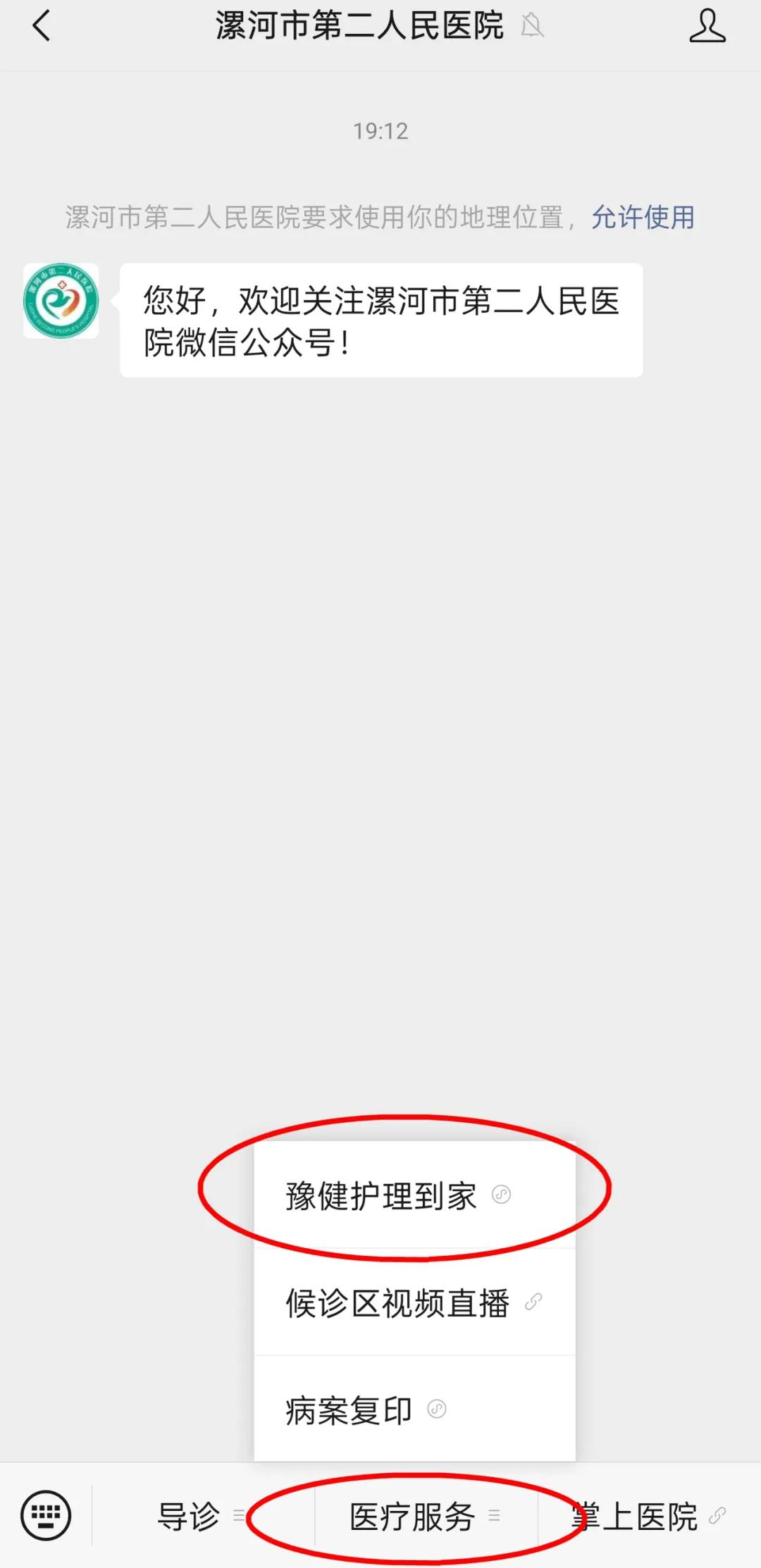 方法一:微信搜索“漯河市第二人民醫(yī)院”公眾號(hào)進(jìn)入主頁(yè)面,關(guān)注服務(wù)號(hào)之后,點(diǎn)擊醫(yī)療服務(wù)→豫健護(hù)理到家項(xiàng)目。
