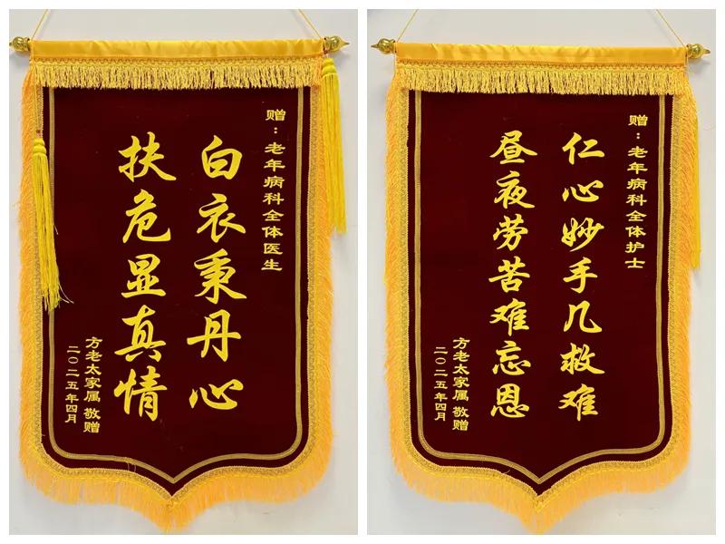 近日,兩面紅底金字的錦旗被鄭重送至市二院老年醫(yī)學(xué)科。家屬哽咽著展開錦旗:“白心秉丹心,扶危顯真情”致全體醫(yī)生,“仁心妙手幾救難,晝夜勞苦難忘恩”贈與醫(yī)護(hù)團(tuán)隊(duì)。這不僅是患者家屬的深情告白,是百歲老人方奶奶與老年醫(yī)學(xué)科醫(yī)護(hù)團(tuán)隊(duì)五年多、1800多個日夜的生死相托,更是一個家庭對“醫(yī)者仁心”最深情的詮釋。