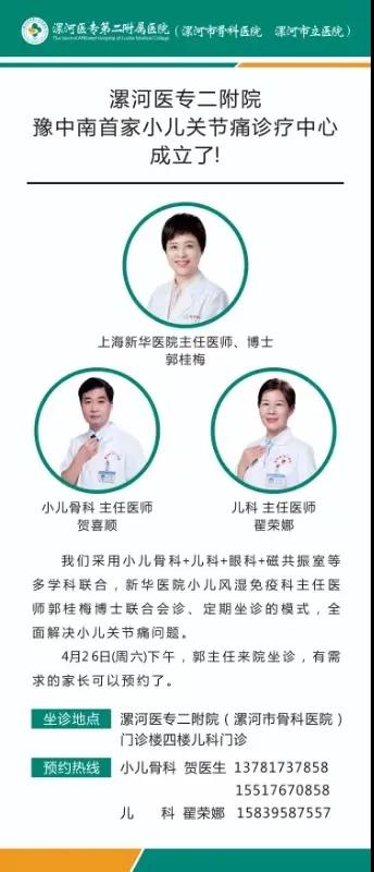 小兒關(guān)節(jié)痛診斷和治療的關(guān)鍵是通過(guò)專業(yè)診斷來(lái)區(qū)分不同的病因,為此,漯河醫(yī)專二附院(漯河市骨科醫(yī)院,漯河市立醫(yī)院)成立了豫中南地區(qū)首家“小兒關(guān)節(jié)痛多學(xué)科診療中心”!
