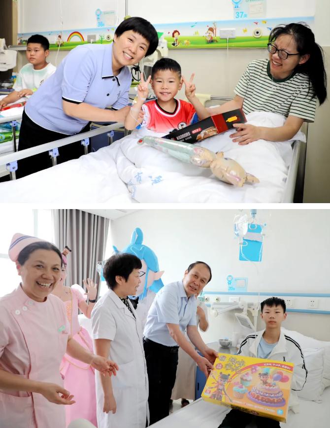 在孩子們期待的目光中,黨委書記魏松、院長(zhǎng)胡海英攜班子成員和兒科專家們?yōu)楹⒆觽円黄鹎邢虏⒎窒砉?jié)日蛋糕,“愿寶貝們心里有愛,眼里有光,永遠(yuǎn)做自己的小太陽(yáng)!”真摯的祝福隨蛋糕甜香漫溢全場(chǎng)。