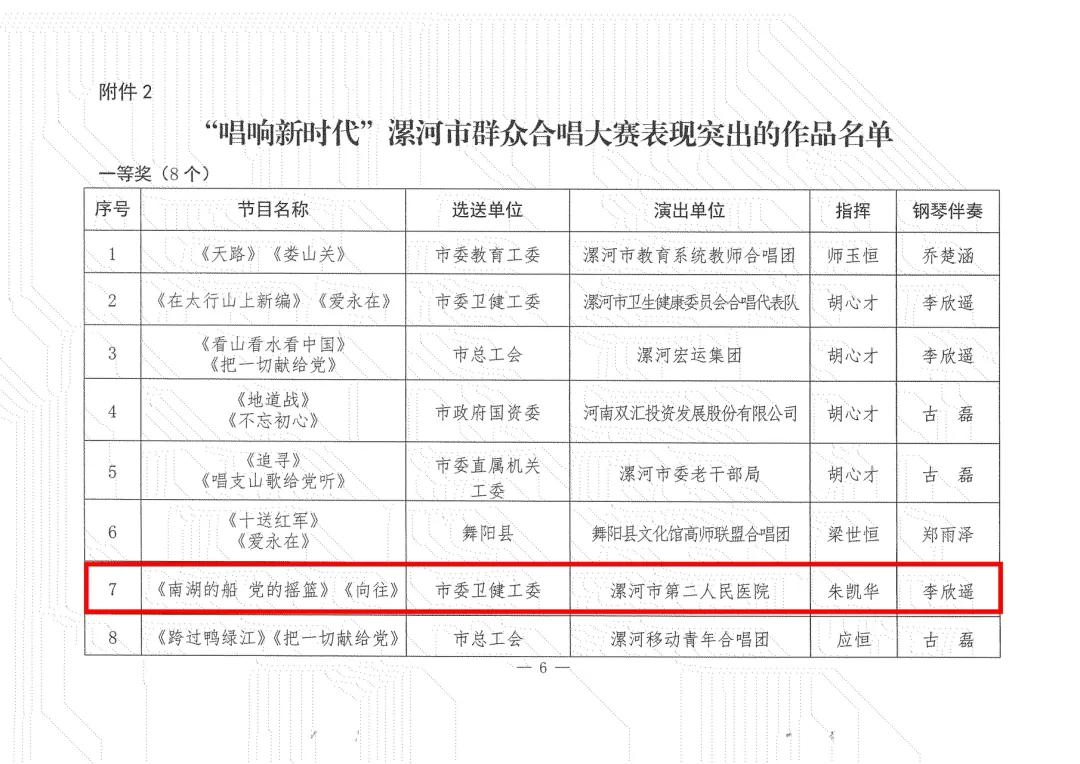 近日,漯河市文化廣電和旅游局下發(fā)《關于表彰“豫出彩 一起來”2024漯河市惠民文化活動和“紅紅火火過大年”漯河市2025年民間藝術展演活動表現(xiàn)突出的作品節(jié)目的通報》,市二院參賽曲目榮獲“唱響新時代”漯河市群眾合唱大賽一等獎。