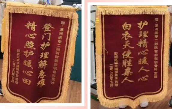 “真是太感謝孟冰和王露護士了,這兩面錦旗你們一定要收下!”7月16日,一名老年患者家屬將兩面錦旗送到了漯河醫(yī)專二附院(漯河市骨科醫(yī)院、漯河市立醫(yī)院)智能微創(chuàng)骨科護士站,再三感謝兩位護士上門為老人維護、更換導(dǎo)尿管。