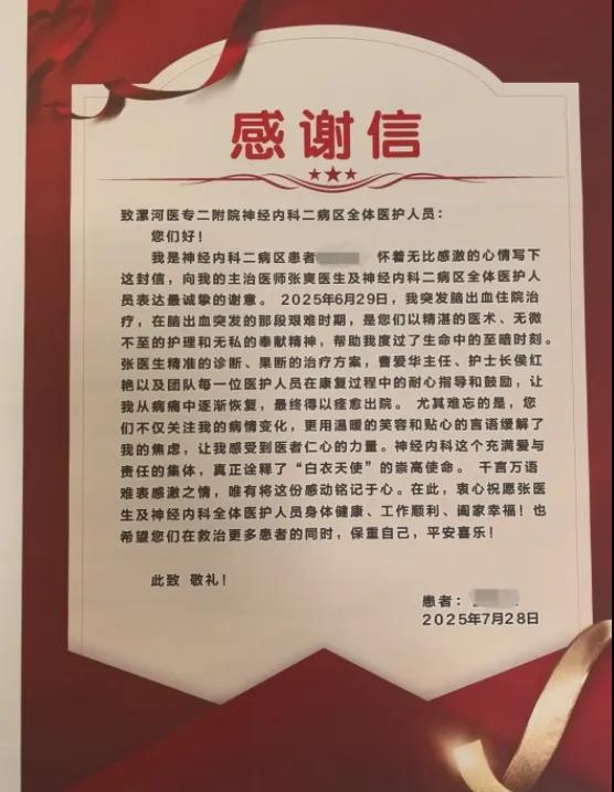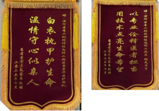 “你們不僅關(guān)注我的病情變化,更用溫暖的笑容和貼心的言語緩解了我的焦慮,讓我感受到醫(yī)者仁心的力量。”康復(fù)出院后,患者及家屬攜錦旗與感謝信再次來到醫(yī)院,他們把“以專業(yè)詮釋醫(yī)者擔(dān)當(dāng) 用技術(shù)點亮生命希望”、“白衣執(zhí)甲護生命 溫情守心似親人”這樣的贊譽送給醫(yī)護人員,表達著對醫(yī)護團隊的認(rèn)可,也彰顯了醫(yī)院多學(xué)科聯(lián)合會診機制,院前急救、院內(nèi)急診、院內(nèi)救治全流程閉環(huán)管理的顯著優(yōu)勢。
