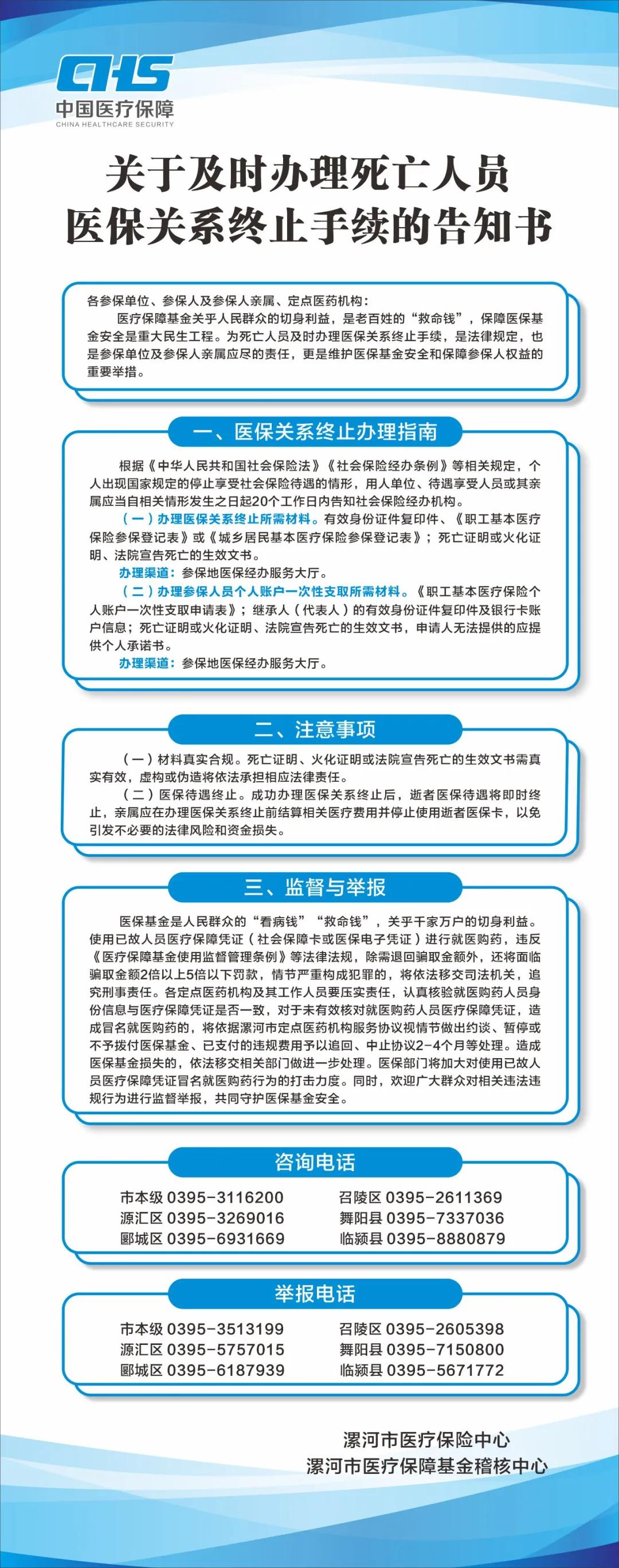 漯河市中醫(yī)院:關于及時辦理死亡人員醫(yī)保關系終止手續(xù)的告知書