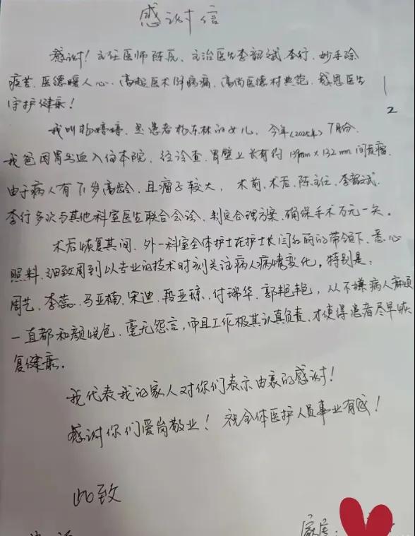 這封感謝信,是對普通外科全體醫(yī)護人員,尤其是對護理團隊辛勤付出和專業(yè)精神的高度認可與鼓勵。對團隊而言,患者的康復和家屬的滿意是他們最大的追求。普通外科團隊將繼續(xù)秉承“以患者為中心”的服務理念,不斷精進醫(yī)療技術(shù),提升護理服務質(zhì)量,尤其是加強復雜、高齡患者圍手術(shù)期的精細化、人性化護理管理,用精湛的醫(yī)術(shù)祛除病痛,用溫暖的仁心守護健康,為更多患者帶來康復的希望和家的溫暖。(盧 闖 閆紅麗 劉 旭 袁錦鈺)