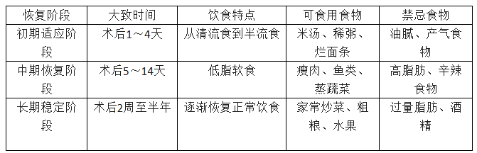 1.術(shù)后第1~2天,腸道功能尚未恢復(fù),此時通常需要禁食,待腸蠕動恢復(fù)、肛門排氣后,可開始進(jìn)食清流食。