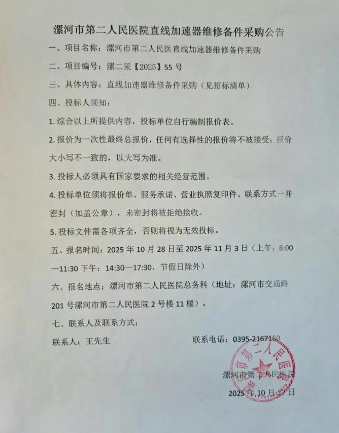 漯河市第二人民醫(yī)院直線加速器維修備件采購公告