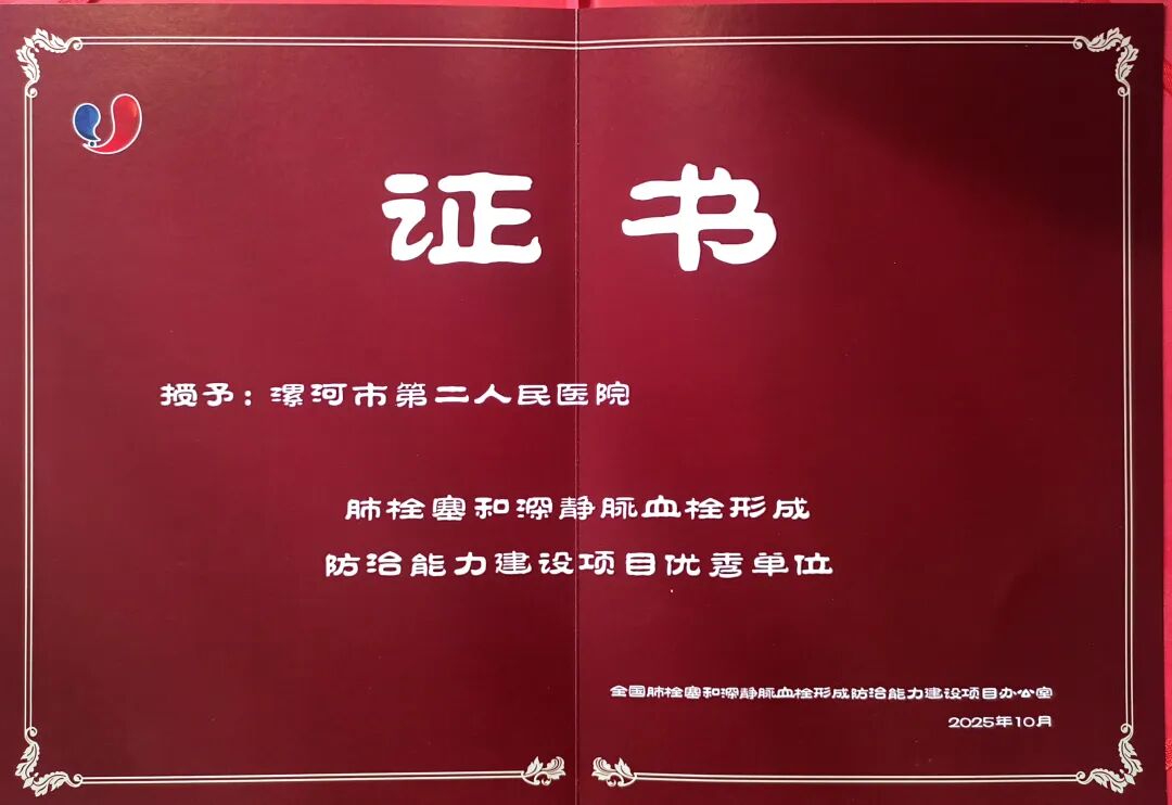 漯河市二院獲評(píng)“全國肺栓塞和深靜脈血栓形成防治能力建設(shè)項(xiàng)目優(yōu)秀單位”