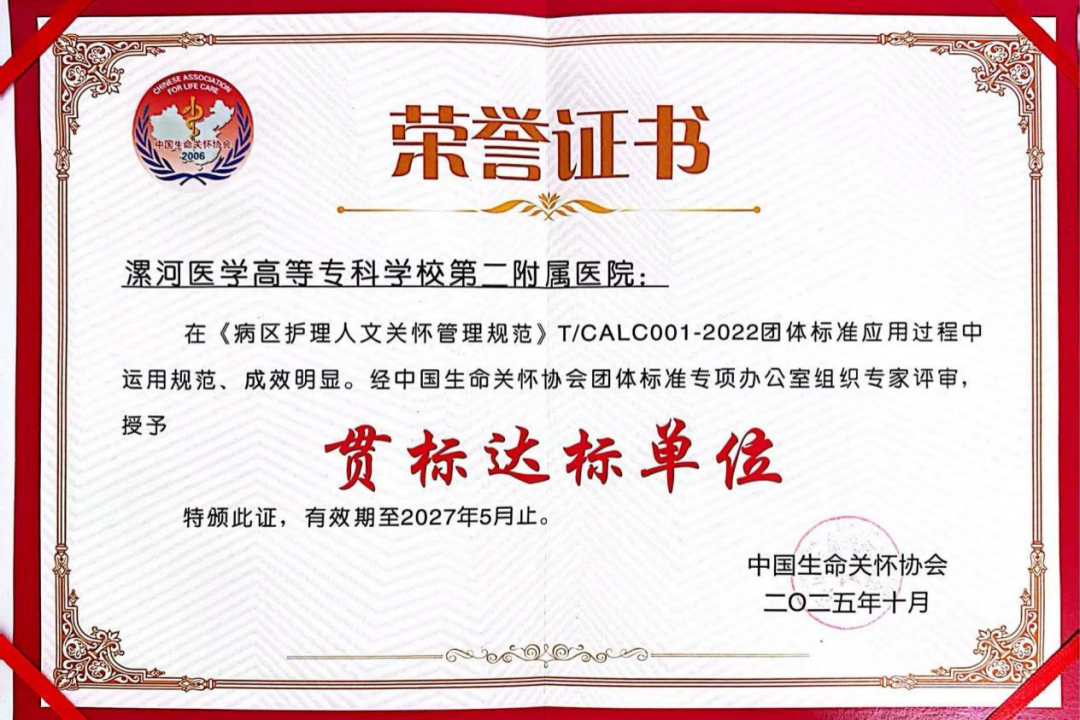 10月30日—11月2日,由國家生命關(guān)懷協(xié)會(huì)主辦、華中科技大學(xué)同濟(jì)醫(yī)學(xué)院附屬協(xié)和醫(yī)院承辦的國家級(jí)繼續(xù)教育項(xiàng)目“醫(yī)院護(hù)理人文關(guān)懷標(biāo)準(zhǔn)化建設(shè)”會(huì)議在武漢召開。此次大會(huì)以“關(guān)懷實(shí)踐 標(biāo)準(zhǔn)引領(lǐng)”為主題,匯聚了來自29個(gè)省(市、自治區(qū))的護(hù)理界領(lǐng)導(dǎo)與專家,共同探討與展示醫(yī)學(xué)人文關(guān)懷標(biāo)準(zhǔn)化建設(shè)的前沿理論與實(shí)踐成果。在備受矚目的授牌儀式環(huán)節(jié),大會(huì)正式公布了《病區(qū)護(hù)理人文關(guān)懷管理規(guī)范》團(tuán)體標(biāo)準(zhǔn)第二批貫標(biāo)驗(yàn)收評(píng)審結(jié)果,并現(xiàn)場為達(dá)標(biāo)單位授牌、頒發(fā)證書。漯河醫(yī)專二附院(漯河市骨科醫(yī)院、漯河市立醫(yī)院)憑借在人文護(hù)理領(lǐng)域扎實(shí)的工作成效和卓越的服務(wù)水平,成功通過評(píng)審,被正式授予“《病區(qū)護(hù)理人文關(guān)懷管理規(guī)范》團(tuán)體標(biāo)準(zhǔn)貫標(biāo)達(dá)標(biāo)單位”。