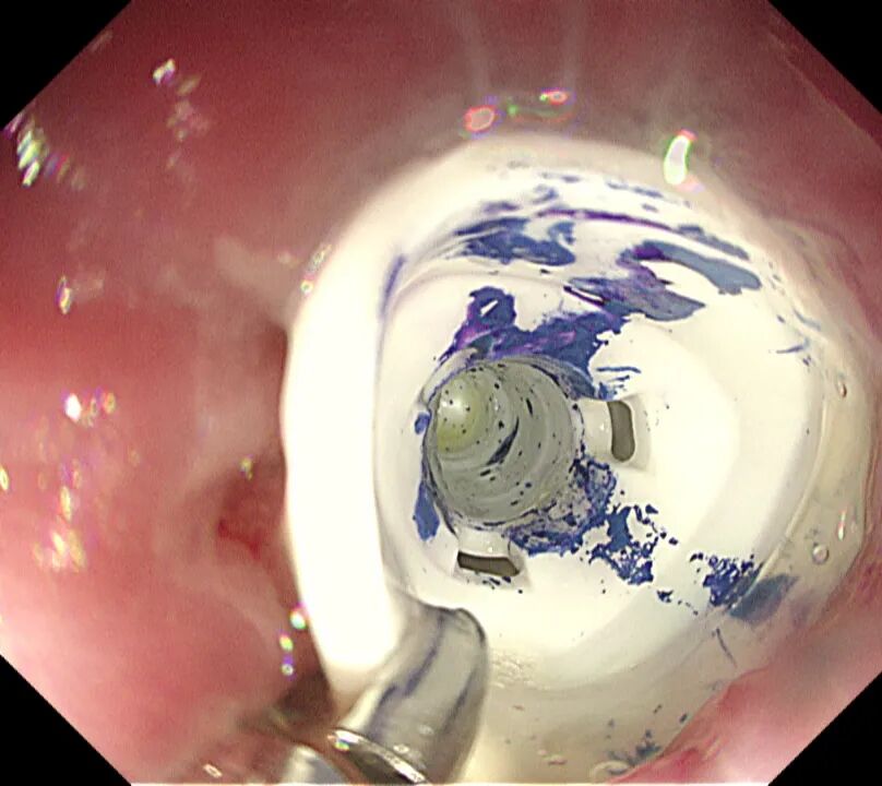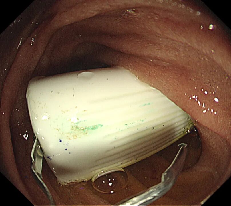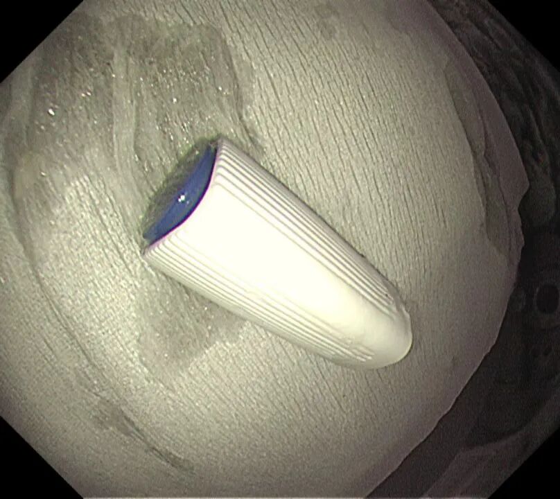 時(shí)間不等人,雖已臨近晚7點(diǎn),市二院第一時(shí)間啟動(dòng)應(yīng)急響應(yīng)機(jī)制,內(nèi)鏡室、麻醉科醫(yī)護(hù)技立即返崗就位,并經(jīng)院辦等職能部門積極協(xié)調(diào),盡可能縮短術(shù)前準(zhǔn)備時(shí)間,迅速制定了取出異物的方案。隨后,在全身麻醉下,朗朗安然入睡,醫(yī)生通過纖細(xì)的胃鏡,精準(zhǔn)地找到了那個(gè)“惹事”的筆帽位于十二指腸內(nèi),并順利將其取出。整個(gè)過程僅用時(shí)十幾分鐘,朗朗術(shù)后很快蘇醒,觀察無礙后平安回家。