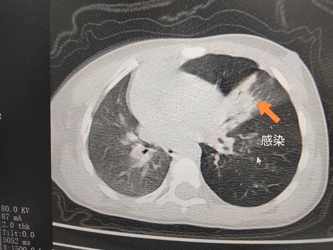 三天后(11月13日),趙寶出現(xiàn)高熱、咳喘加重,家長著急了,再次帶他來到醫(yī)院。CT檢查顯示左肺過度充氣,左肺上下葉支氣管主干見不規(guī)則高密度影,左肺上葉可見大片狀密度增高影,縱隔窗實(shí)變,提示為“左側(cè)支氣管內(nèi)異物并繼發(fā)性改變,左肺上葉舌段肺膨脹不全”。