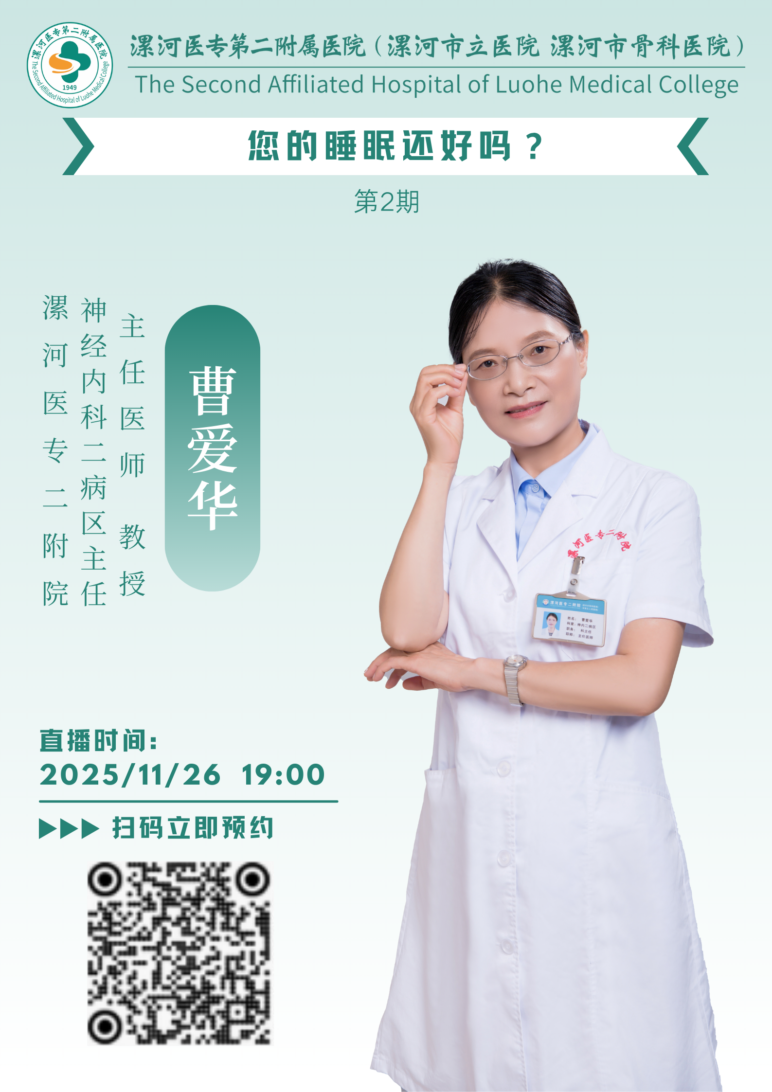 直播預(yù)告|漯河醫(yī)專(zhuān)二附院健康科普“云直播”第二期 您的睡眠還好嗎? “您的睡眠還好嗎?”11月26日(周三)晚7點(diǎn),漯河醫(yī)專(zhuān)二附院(漯河市骨科醫(yī)院、漯河市立醫(yī)院)健康科普“云直播”,邀請(qǐng)漯河市睡眠醫(yī)學(xué)中心負(fù)責(zé)人、漯河醫(yī)專(zhuān)二附院神經(jīng)內(nèi)科二病區(qū)主任曹愛(ài)華教授與您共話(huà)健康睡眠,敬請(qǐng)關(guān)注!