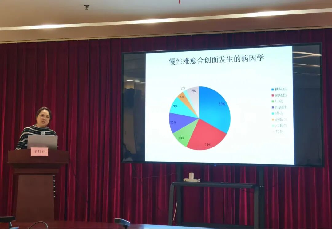 漯河市第三人民醫(yī)院新生兒科護士長馬麗明、漯河醫(yī)專二附院胸外科護士長丁亞楠共同主持,由河南省傷口造口專業(yè)委員會副主任委員、國際造口治療師王月芹教授主講的首場授課。王教授以《慢性創(chuàng)面治療策略》為題,深入淺出地講解了慢性創(chuàng)面治療策略核心是圍繞“病因控制-創(chuàng)面床準備-修復重建”三大核心環(huán)節(jié),通過多學科協(xié)作,動態(tài)調(diào)整方案以打破創(chuàng)面遷延不愈的惡性循環(huán)。王教授帶來最前沿的學術(shù)成果、用最鮮活的臨床案例和最實用的操作技巧。讓我們收獲解決實際問題的“金鑰匙”。