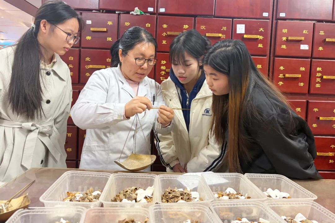 在市中醫(yī)院藥學(xué)部副主任白冰、陳志軍陪同下,師生們先后走進(jìn)精品藥房、散裝飲片藥房、西藥房、制劑藥房、藥庫及臨床藥學(xué)室。從貴細(xì)藥材的鑒別儲(chǔ)存、“戥子稱量”的傳統(tǒng)技藝,到現(xiàn)代化藥房的高效管理、臨床藥師的一線用藥案例,同學(xué)們沉浸式感受了從傳統(tǒng)中醫(yī)藥到現(xiàn)代藥學(xué)服務(wù)的魅力。