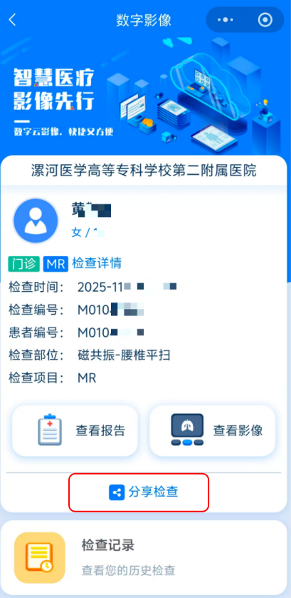 06 如果想要把患者影像資料分享給他人,請(qǐng)?jiān)诨颊邫z查登錄頁內(nèi)點(diǎn)擊“分享檢查”。