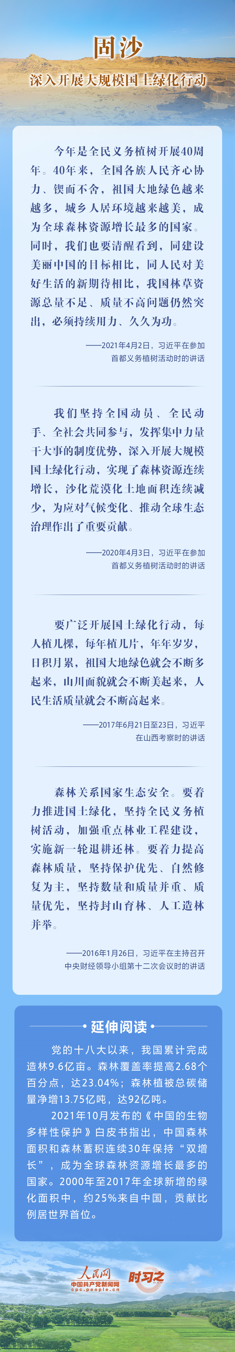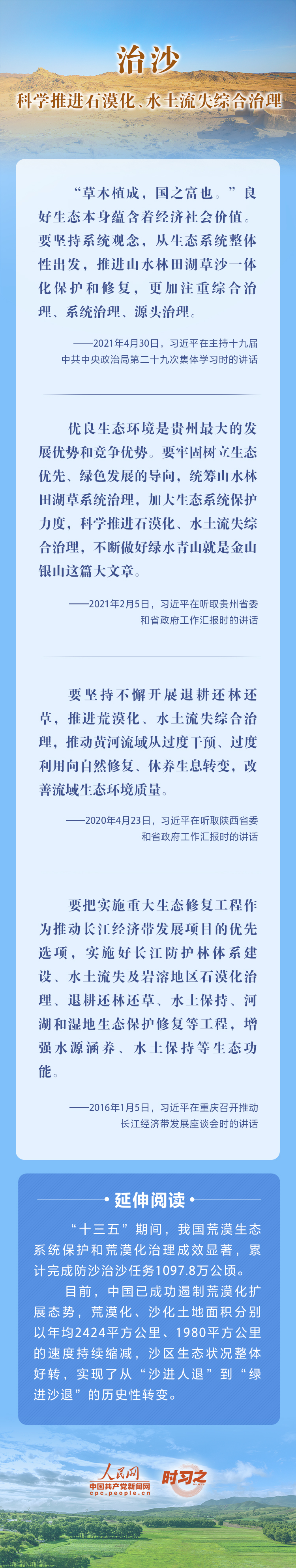 2022年6月17日是第二十八個(gè)世界防治荒漠化與干旱日?;哪侨蛎媾R的重大生態(tài)問(wèn)題,黨的十八大以來(lái),在習(xí)近平生態(tài)文明思想的指引下,我國(guó)荒漠化防治工作開(kāi)辟了新境界、邁上了新臺(tái)階。讓我們一起從總書(shū)記的重要論述里學(xué)習(xí)領(lǐng)悟中國(guó)踐行綠色發(fā)展理念,堅(jiān)定走好荒漠化防治之路的決心。