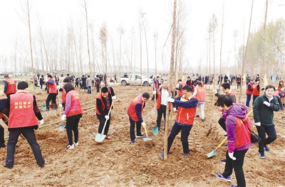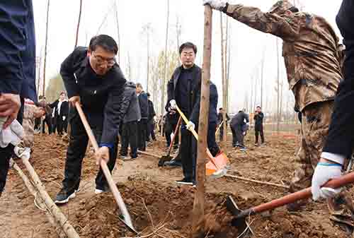 劉尚進、李亦博、李思杰、楊驍、蔣志安、高喜東、周新鶴、張宏進、辛偉、陳平、周學(xué)功、栗社臣、余偉、呂娜、徐匯川、閆天常、胡新峰、宗萬志、田冠亭及市中級人民法院院長陳松林、市人民檢察院檢察長陳連東與市直及駐漯各單位主要負責人,市教育、衛(wèi)生、工商、公安、青年志愿者等社會各界代表600余人,來到沙河國家濕地公園合理利用區(qū)內(nèi)參加義務(wù)植樹活動。植樹活動現(xiàn)場一派熱火朝天的景象,有的移苗扶苗,有的揮鍬鏟土,有的踩土壓實,有的拎桶澆水,不大一會兒就植下一片新綠。