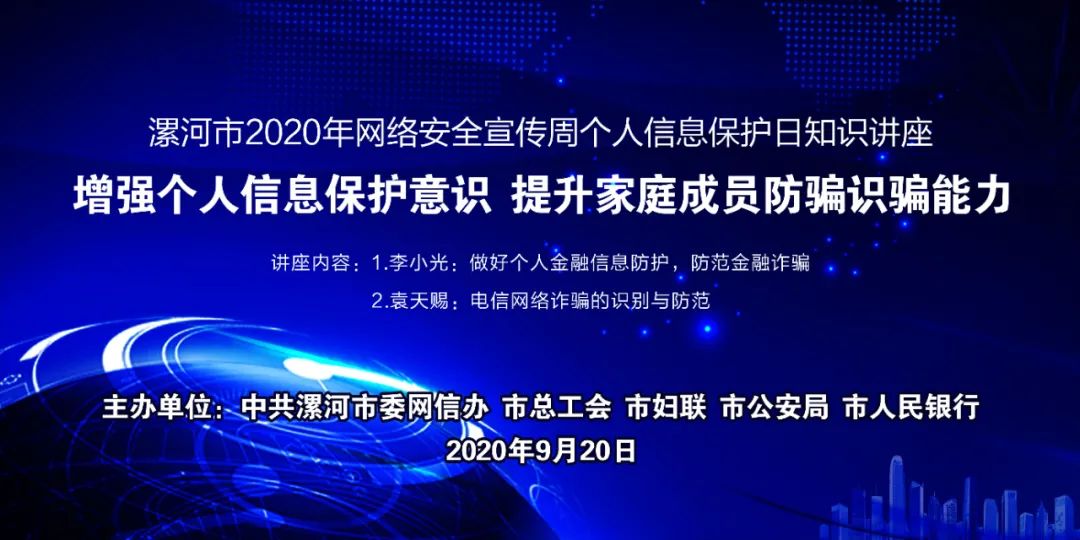 為推動漯河市網(wǎng)絡(luò)安全宣傳周個人信息保護日主題活動深入開展,結(jié)合生活中個人金融信息、電信信息容易被竊取的問題,幫助廣大家庭成員提升金融詐騙、電信網(wǎng)絡(luò)詐騙的防騙識騙能力,中共漯河市委網(wǎng)信辦、市總工會、市婦聯(lián)、市公安局、市人民銀行聯(lián)合舉辦“保護個人信息安全、提升防騙識騙能力”直播授課。