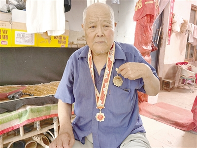 劉付強老人有一個珍藏的袋子,里面放著他的各種證件和國家為他發(fā)放的慶祝中華人民共和國成立70周年紀念章。